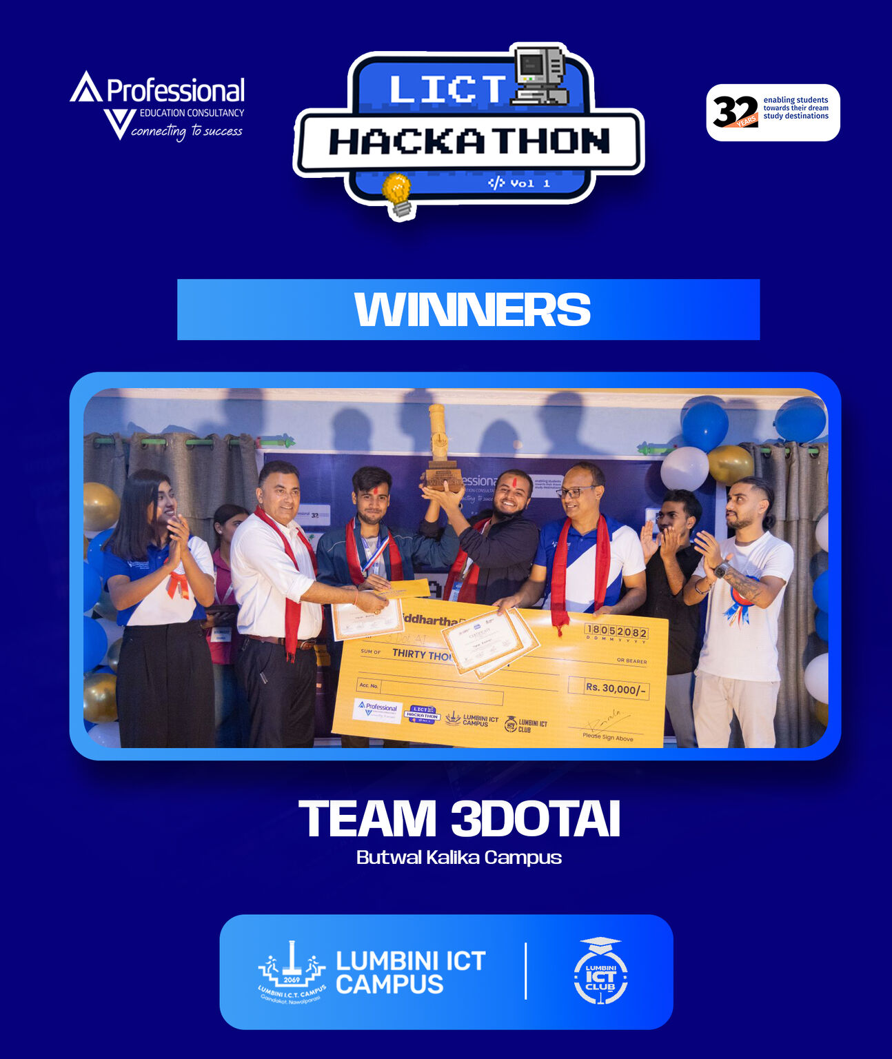 In a remarkable achievement, the BCA students (Tushar Raymajhi and Manish Ghimire) of Butwal Kalika Campus, competing as Team 3DOTAI, emerged victorious at the 48-Hour Hackathon organized by Lumbini ICT Campus and Lumbini ICT Club.